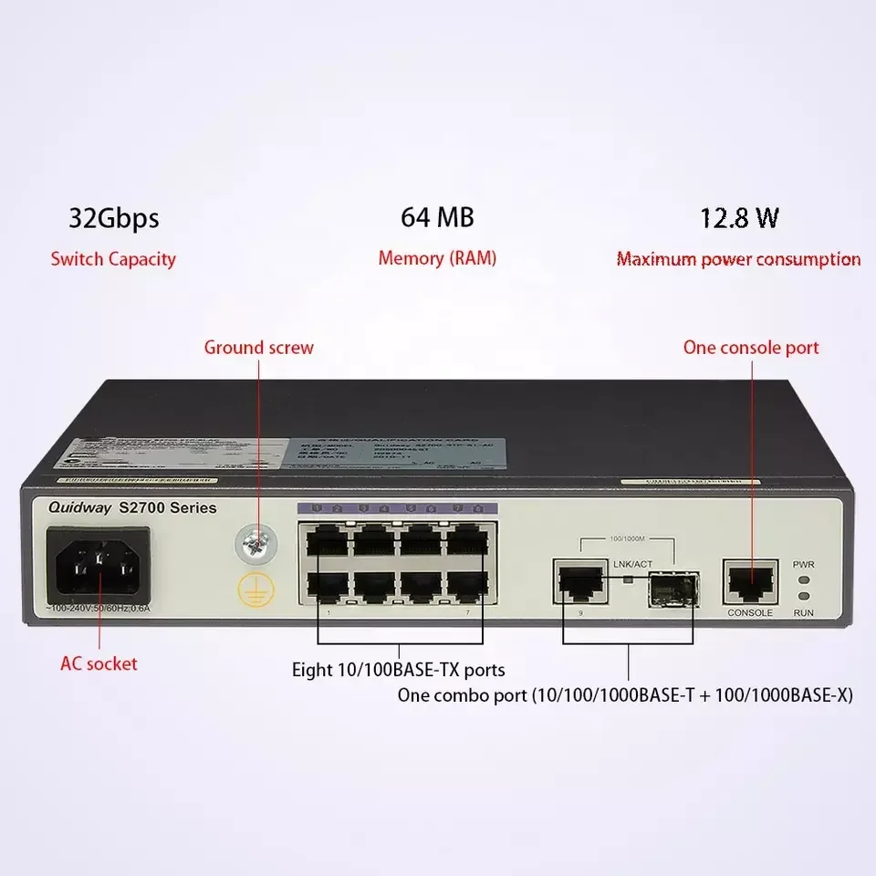 S2700-9TP-SI-AC 02352337 8 Ethernet 10/100 ports,1 dual-purpose 10/100/1000 or SFP S2700 Series Enterprise Switch